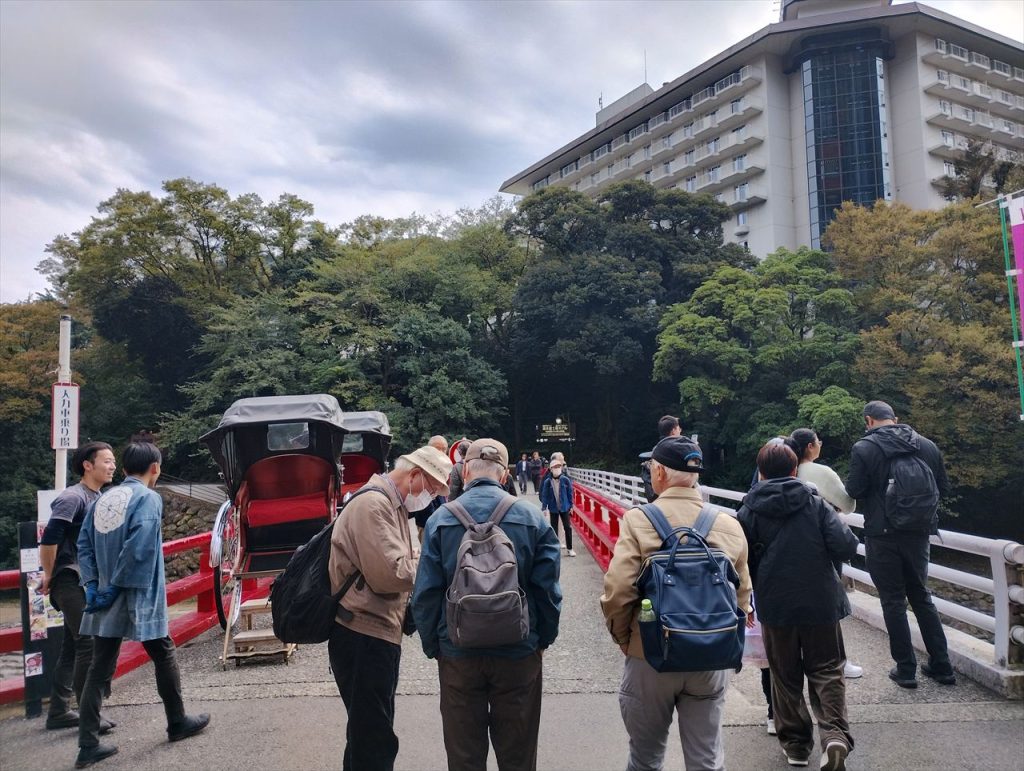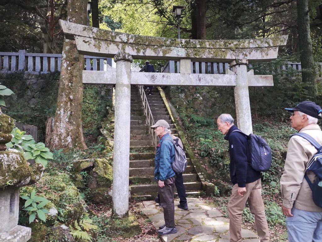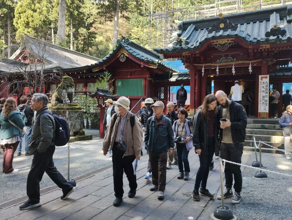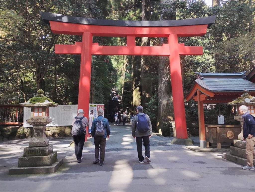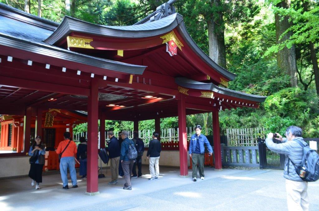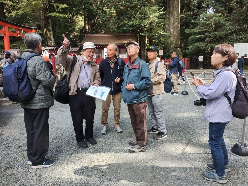 下は、箱根神社と九頭龍神社の説明を聞いているところです。箱根神社は昔は箱根権現と称し、創建は2400年前に遡るのだそうです。塞神は瓊瓊杵尊(ににぎのみこと)、木之花咲耶姫、彦火火出見尊(ひこほほでみのみこと)だそうです。