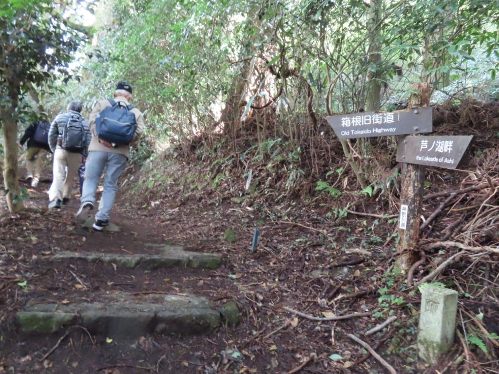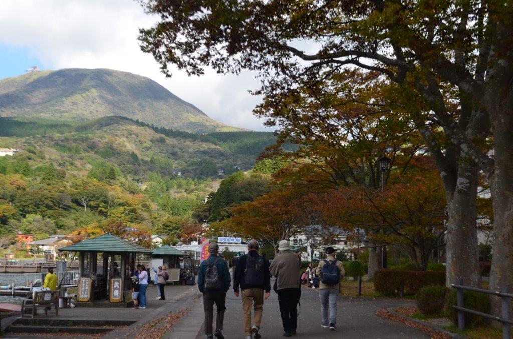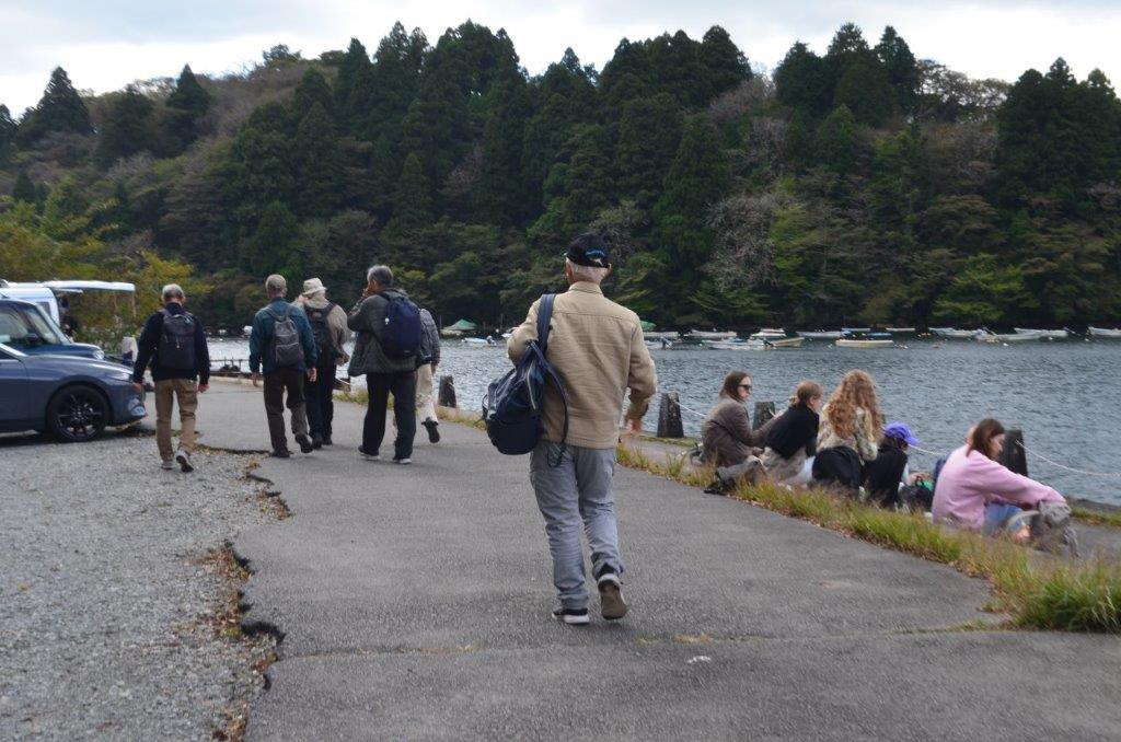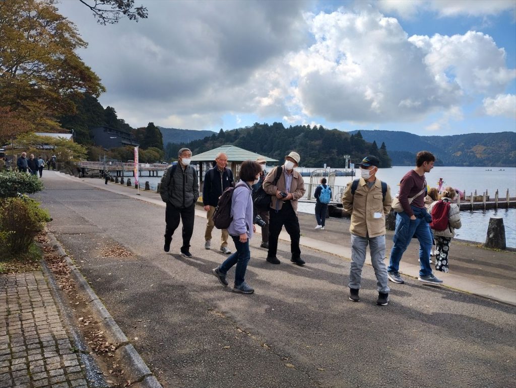 湖畔を箱根関所に向かい歩いています(Nさん撮影)。
