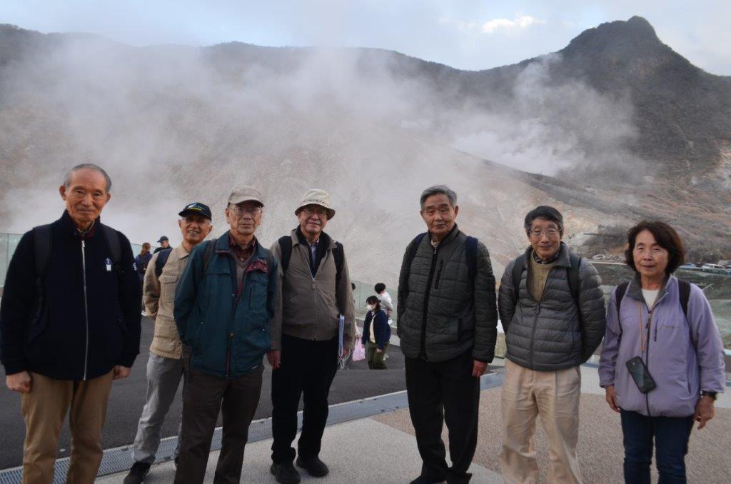 大涌谷の噴煙を背景に、案内係の方にシャッタを押してもらった全員写真です(Nさんのカメラ)。