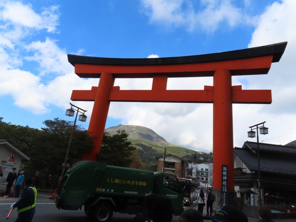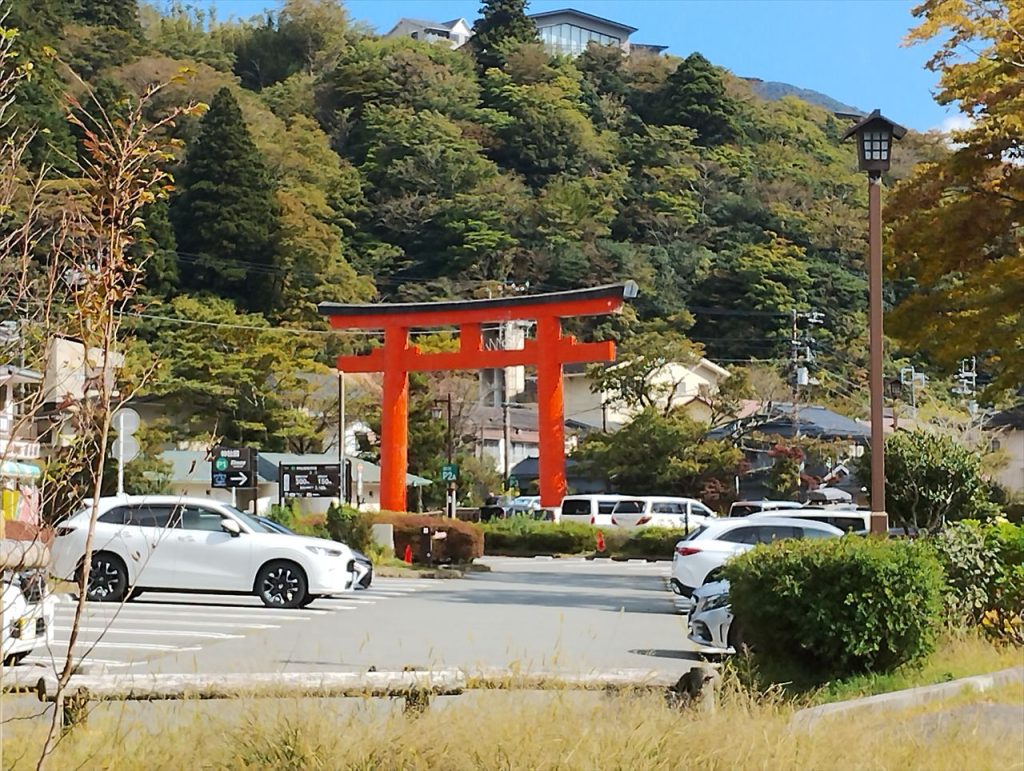 赤く見えるのは箱根神社の一の鳥居の柱です。