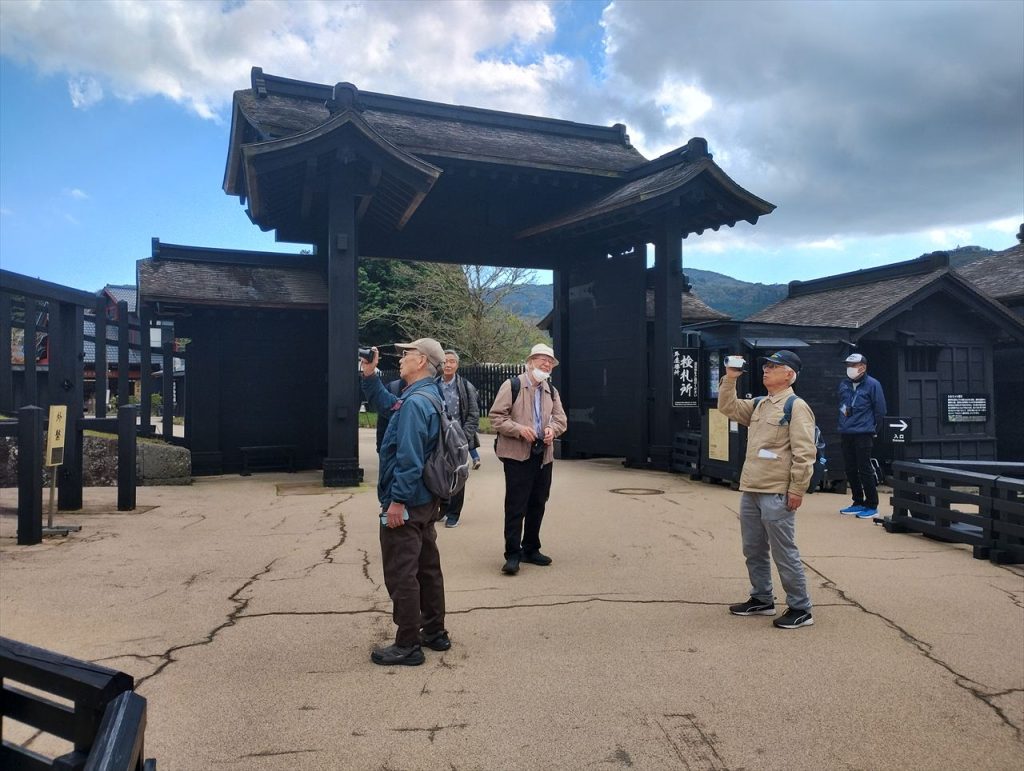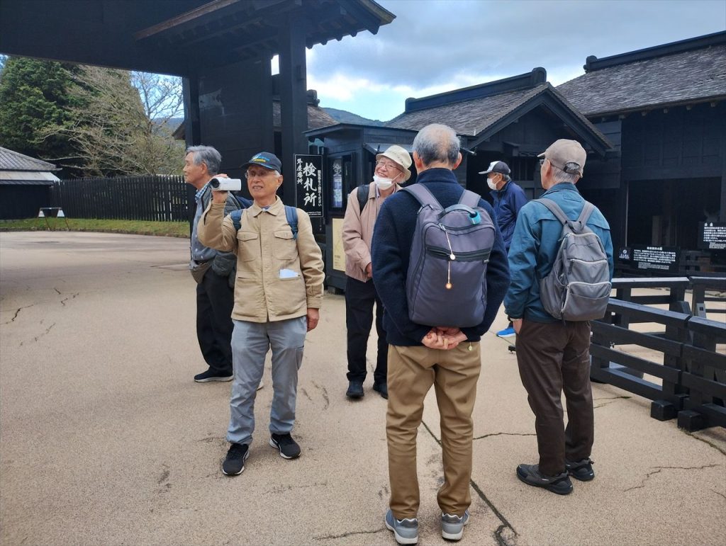 箱根関所の説明を聞いています。