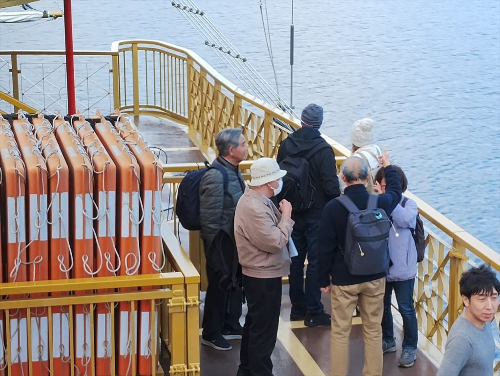 航海中、甲板から芦ノ湖の景色を見ていました。