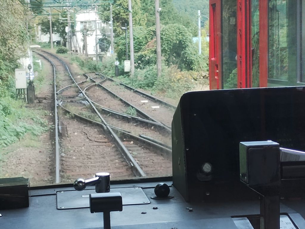 下はスイッチバックの地点です。我々の電車は左側の坂を下ってきました。対向する車両(写真右側の車両)がスイッチバックして坂を登り始めたところです。右の電車が左側の上り坂を進み、その後、我々の電車も動き出し右側の坂を下ります。