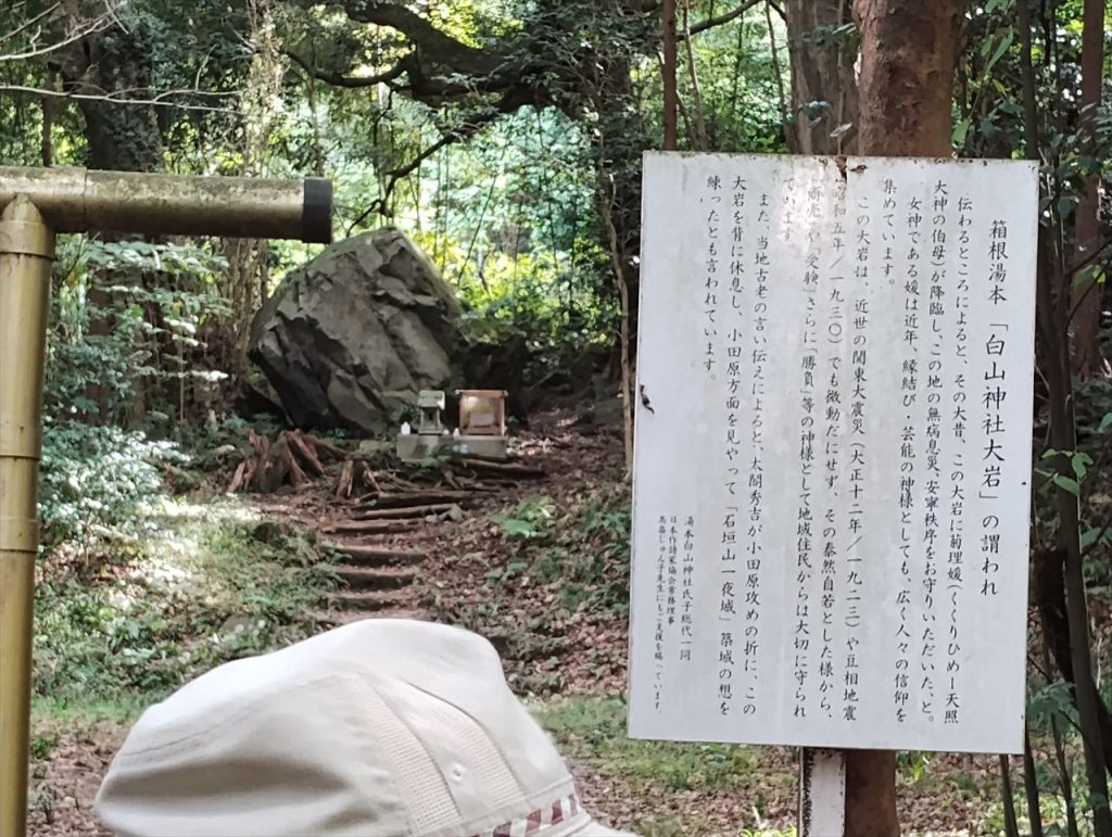 箱根旧街道の説明板を見ています。写真の奥が箱根旧街道で、箱根湯本側です。