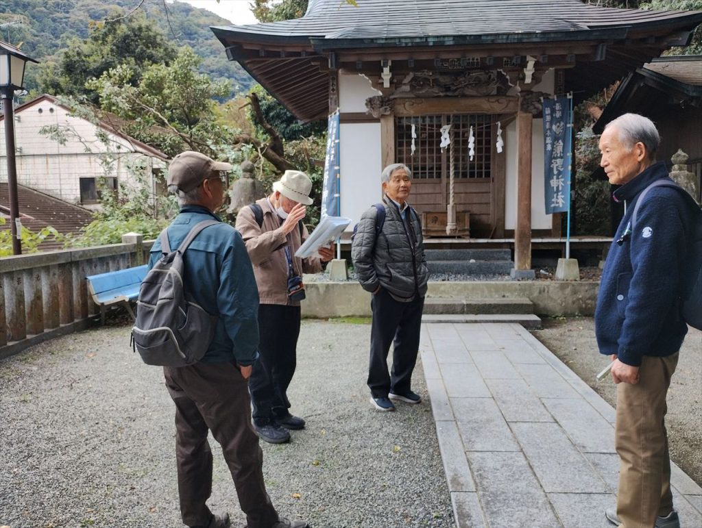 本殿の前で、熊野神社の由緒を聞いています。