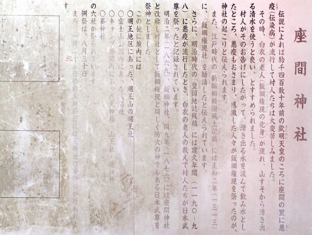 下は、座間神社です。創建時は飯縄権現(いずなごんげん)を祀り、現在は日本武尊(やまとたけるのみこと)を祀るようです。
